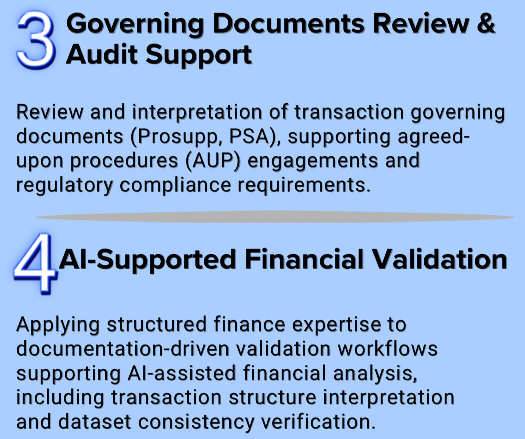 Expert in Finance LLC works alongside structuring, securitization counsel, trustees, and capital markets teams to provide documentation-driven analytics and execution support across the securitization lifecycle:• during issuance preparation and transaction execution